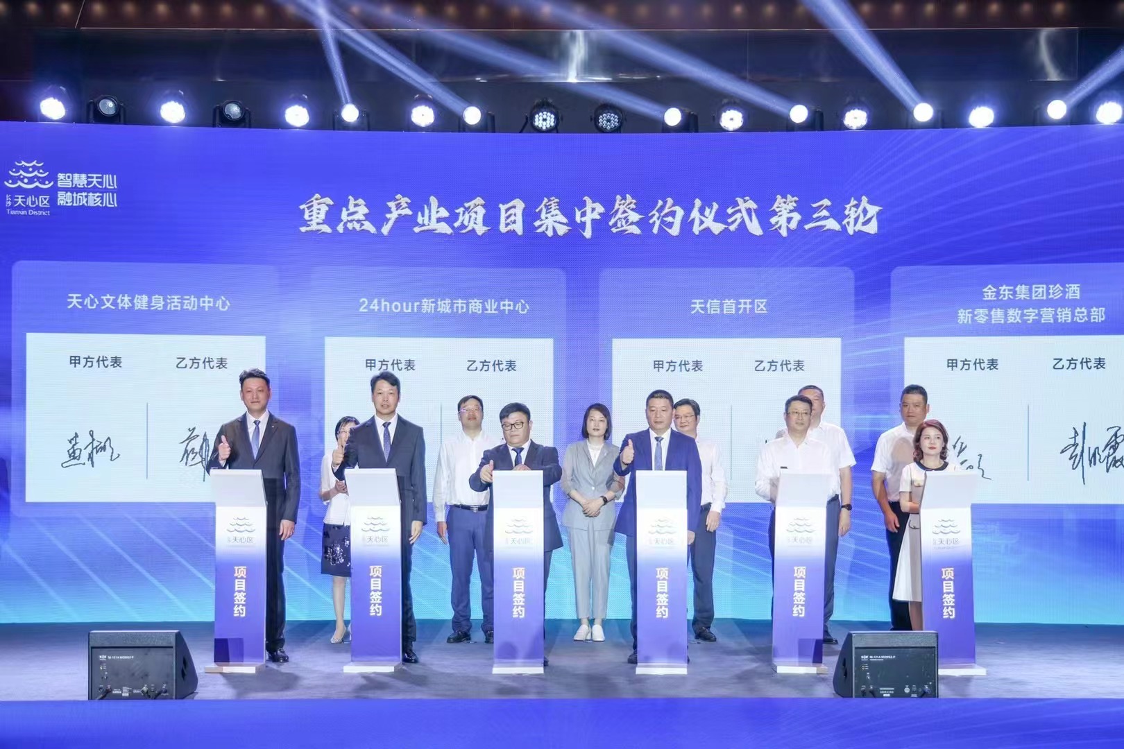 会场上,湘商代表共聚一堂,“招商顾问”纷纷上台,推介天心、宣传天心;“四新经济示范企业”授牌,12个重点招商项目签约,总投资额近100亿元,其中包括天心文投与我司共同布局区域体育消费新赛道—天心区文体活动中心项目。
